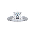 This diamond ring features a three row of round diamonds on the band and diamond basket for tons of sparkle, while still allowing the diamond to take center stage.