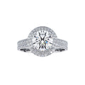 This eye catching engagement ring features a double diamond band and halo with diamond prongs for sparkle at any angle.